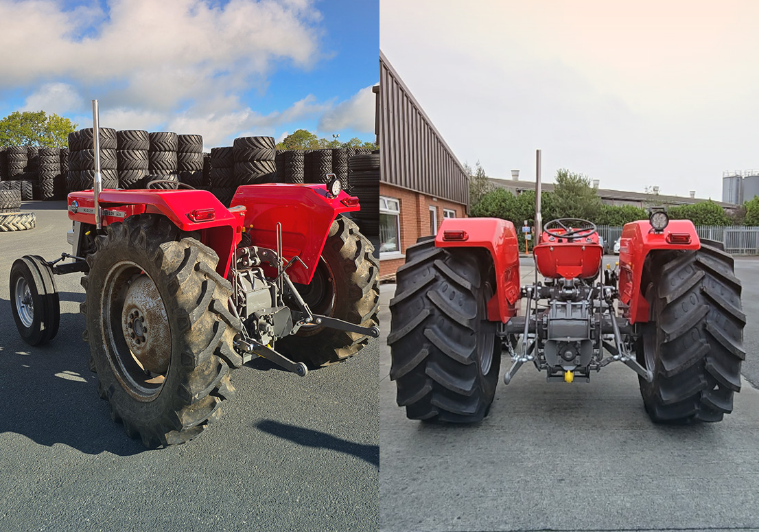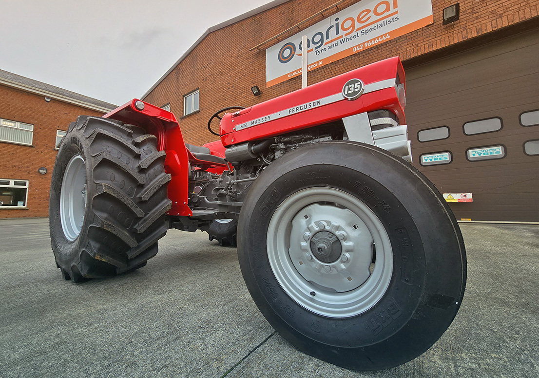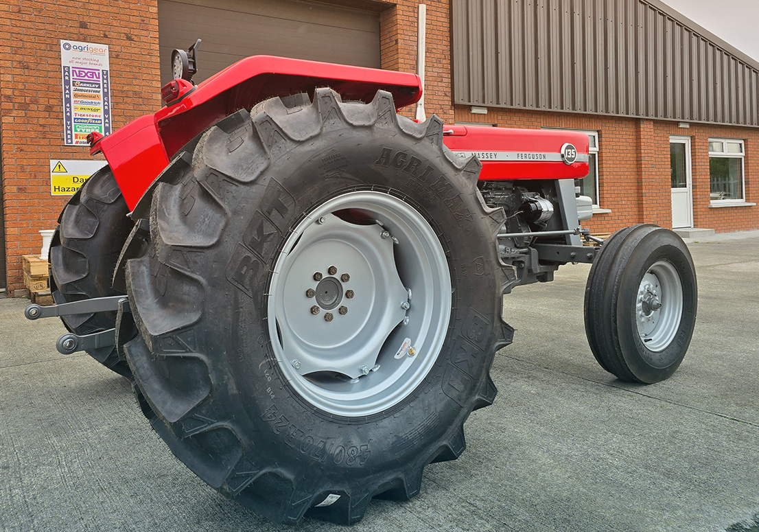 The Story: The owner of this vintage Massey Ferguson 135 wanted to freshen up the tractor while upgrading its stance. The original rims were rusty with damaged paint, so we shot blasted them back to bare metal and powder coated them in the classic Massey Silver. For the rear, the customer requested a wider setup. We manufactured a bespoke set of custom wide rims to suit the tractor and fitted them with new 480/70R24 BKT Agrimax RT 765 tyres. This combination restored the front end while giving the rear improved traction and a broader, more stable footprint.